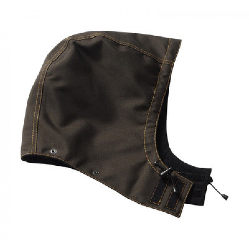 Breathable, wind and waterproof. Taped seams. Fleece lining. Adjustable drawstring at front of waist. Hook and loop band fastening at the chin. Orange contrast stitching. Attaches with press studs. Fits to MASCOT® Tavira.