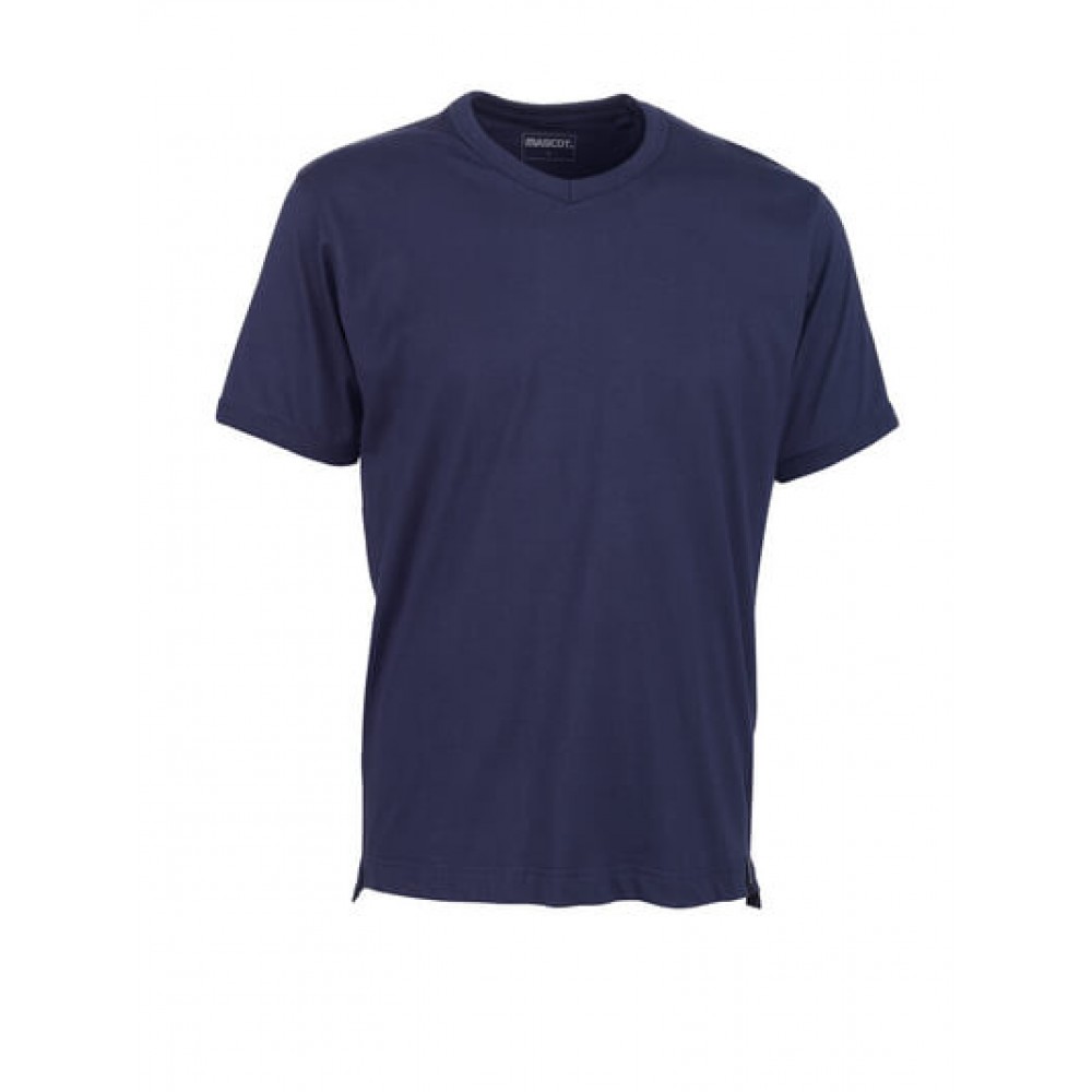 Combed cotton. Strong quality. Preshrunk. Modern fit. V-neck. Rib at neck and sleeves. Neckband. Extended back. Slits in the sides.